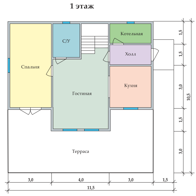 1) Первый этаж: небольшой холл, просторная гостиная, изолированная спальня с отдельным выходом на террасу, а также кухня, санузел и специальное помещение под котельную.