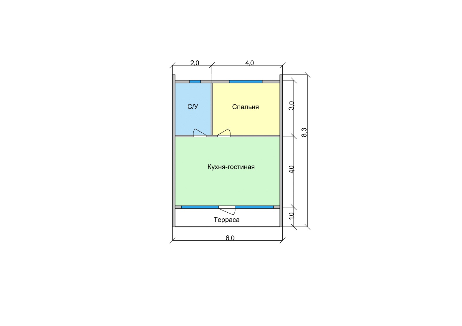 Площадь дома составляет 48 м2. В планировке предусмотрена просторная кухня-гостиная, изолированная спальня и обустроенный санузел. На террасе вполне хватит места, чтобы обустроить комфортную зону отдыха с креслами и столиком.