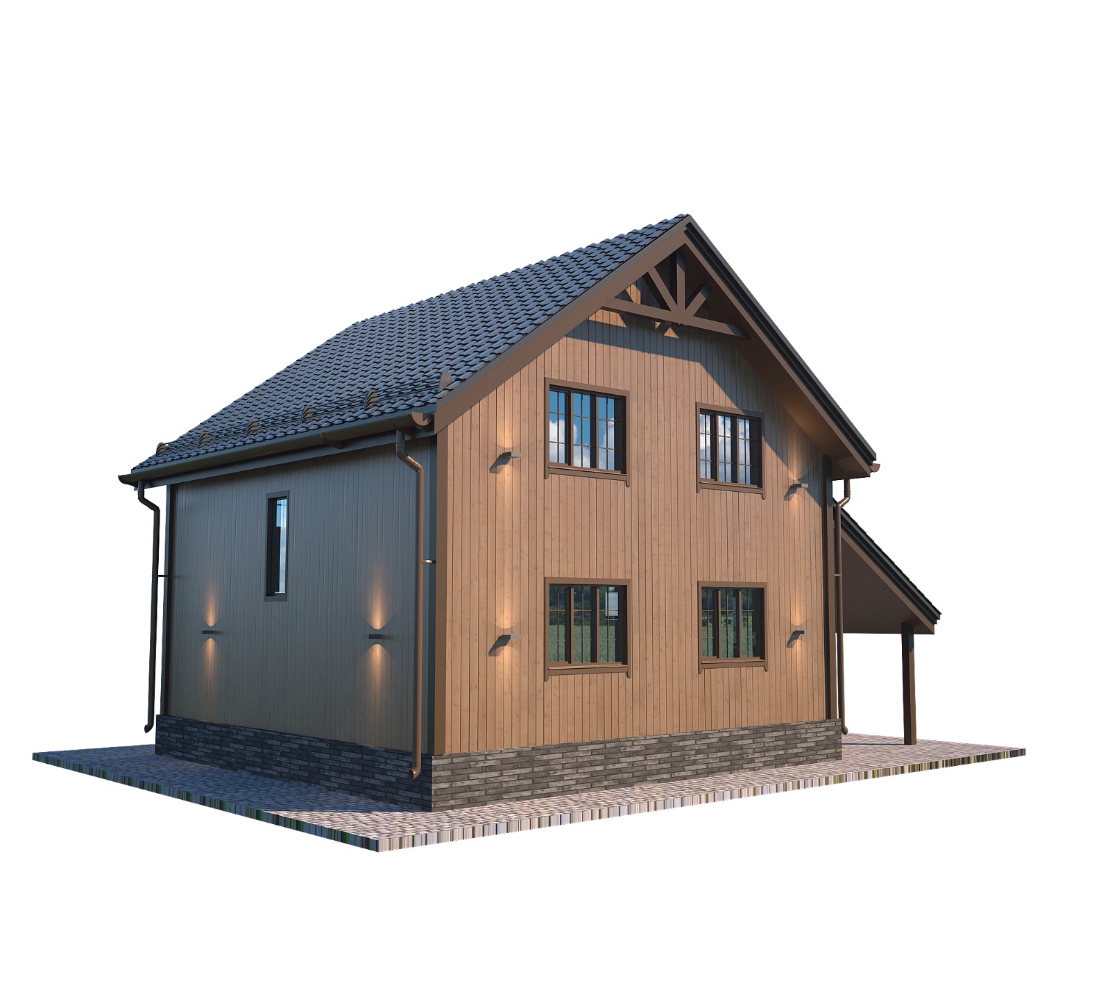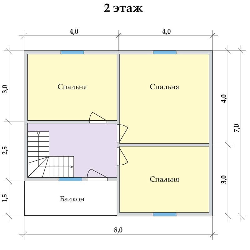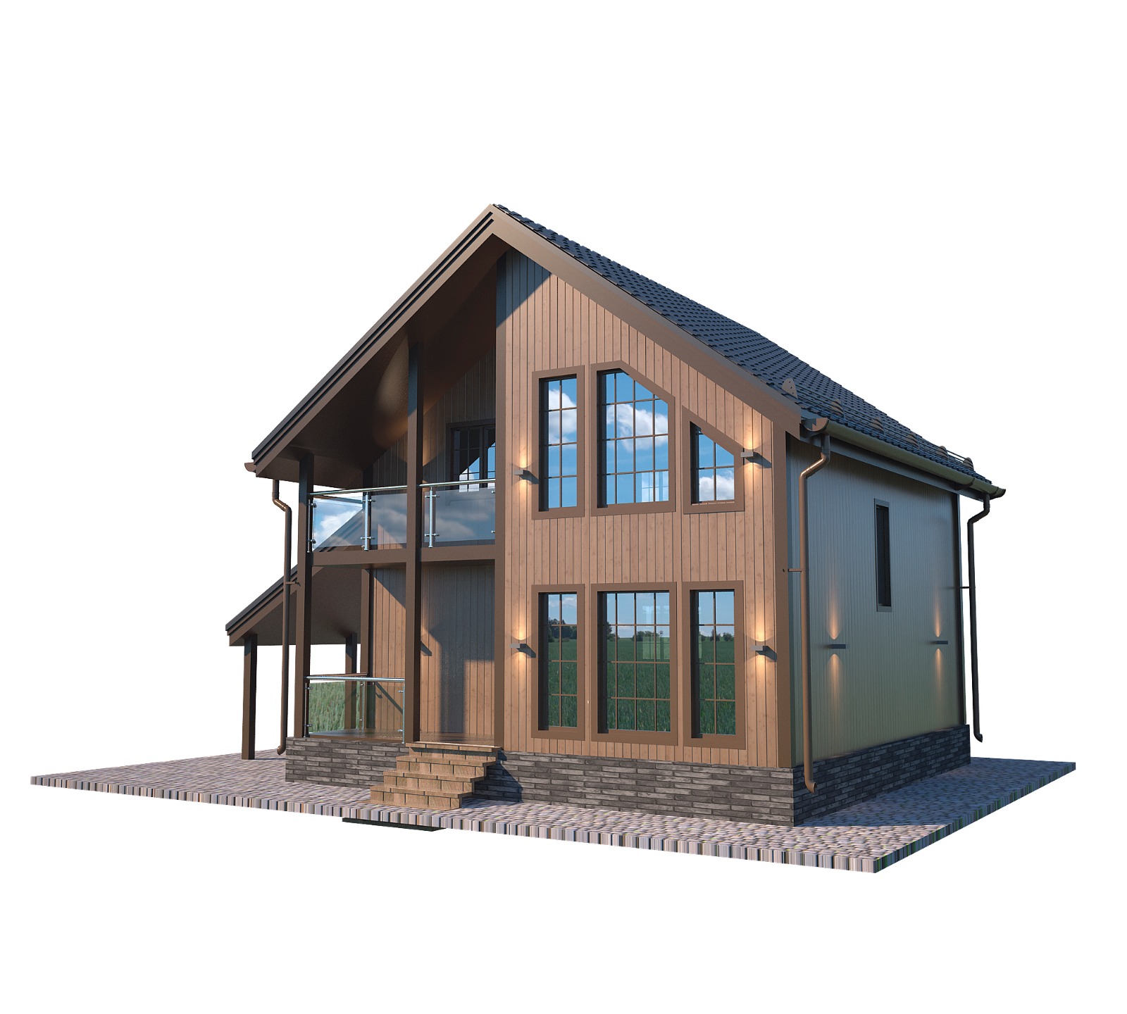 Входные двери металлические, двери в помещениях дома изготовлены из МДФ. Окна металлопластиковые, с двумя стеклами, оснащенные поворотно-откидным механизмом. На мансардном этаже предусмотрены фигурные окна, а также стеклянная отделка балкона в одном из форматов планировки.