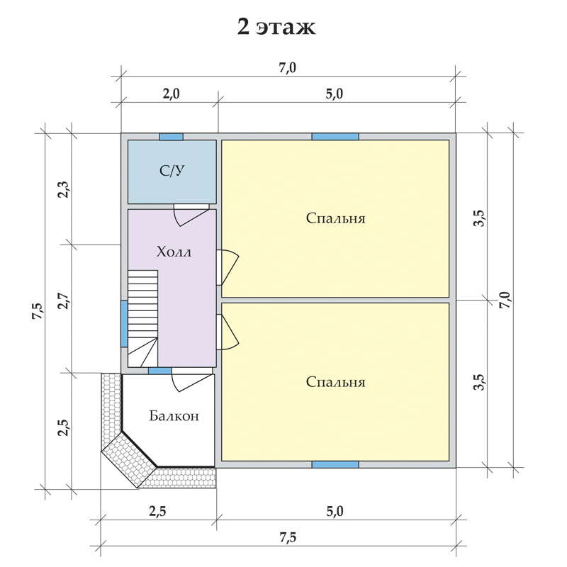 Коттедж «Рассвет 7,5х7,5» – двухэтажный каркасный дом на 3 комнаты, который отличается эргономичной планировкой, гарантирующий комфорт и удобство в повседневной жизни.