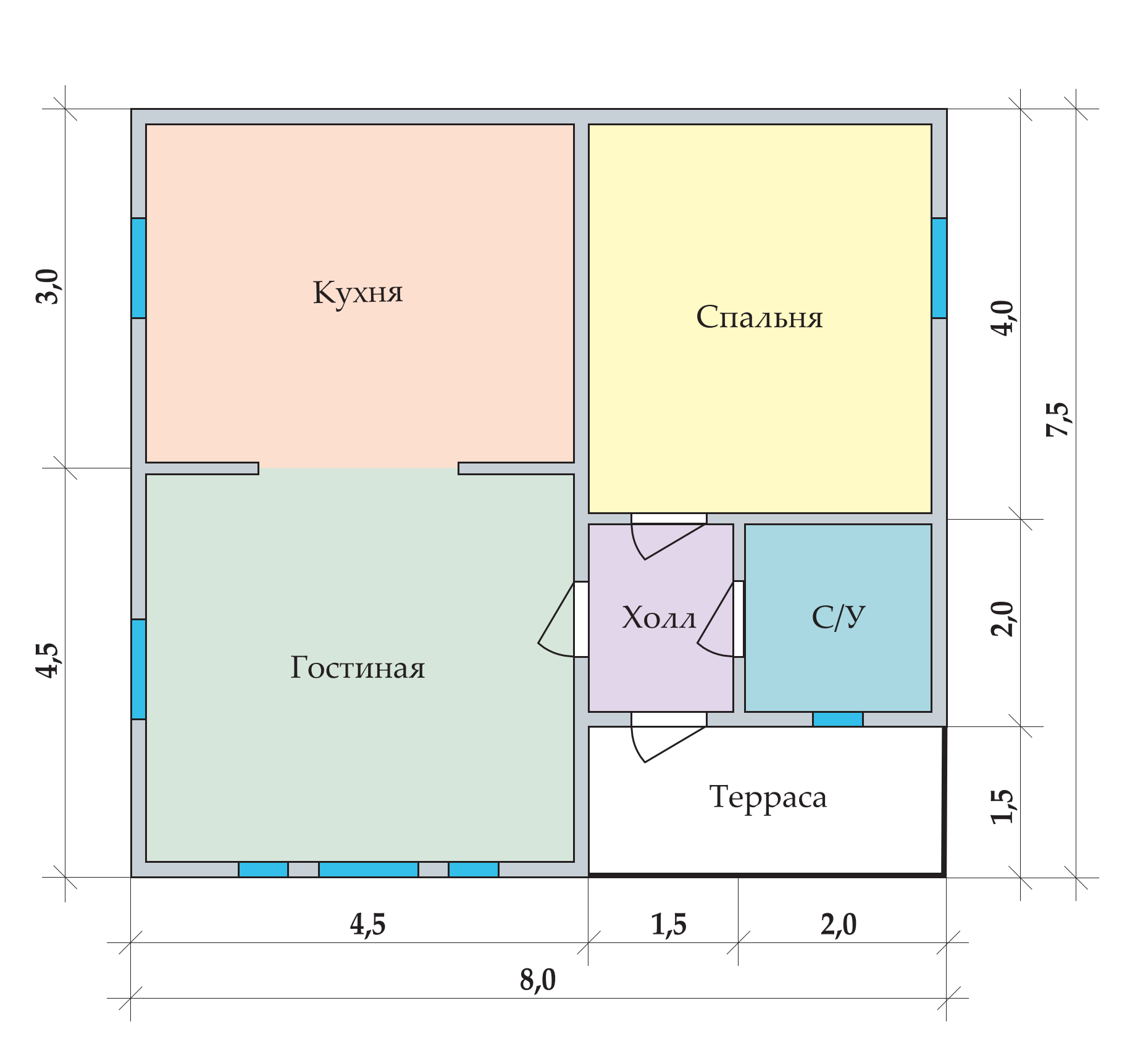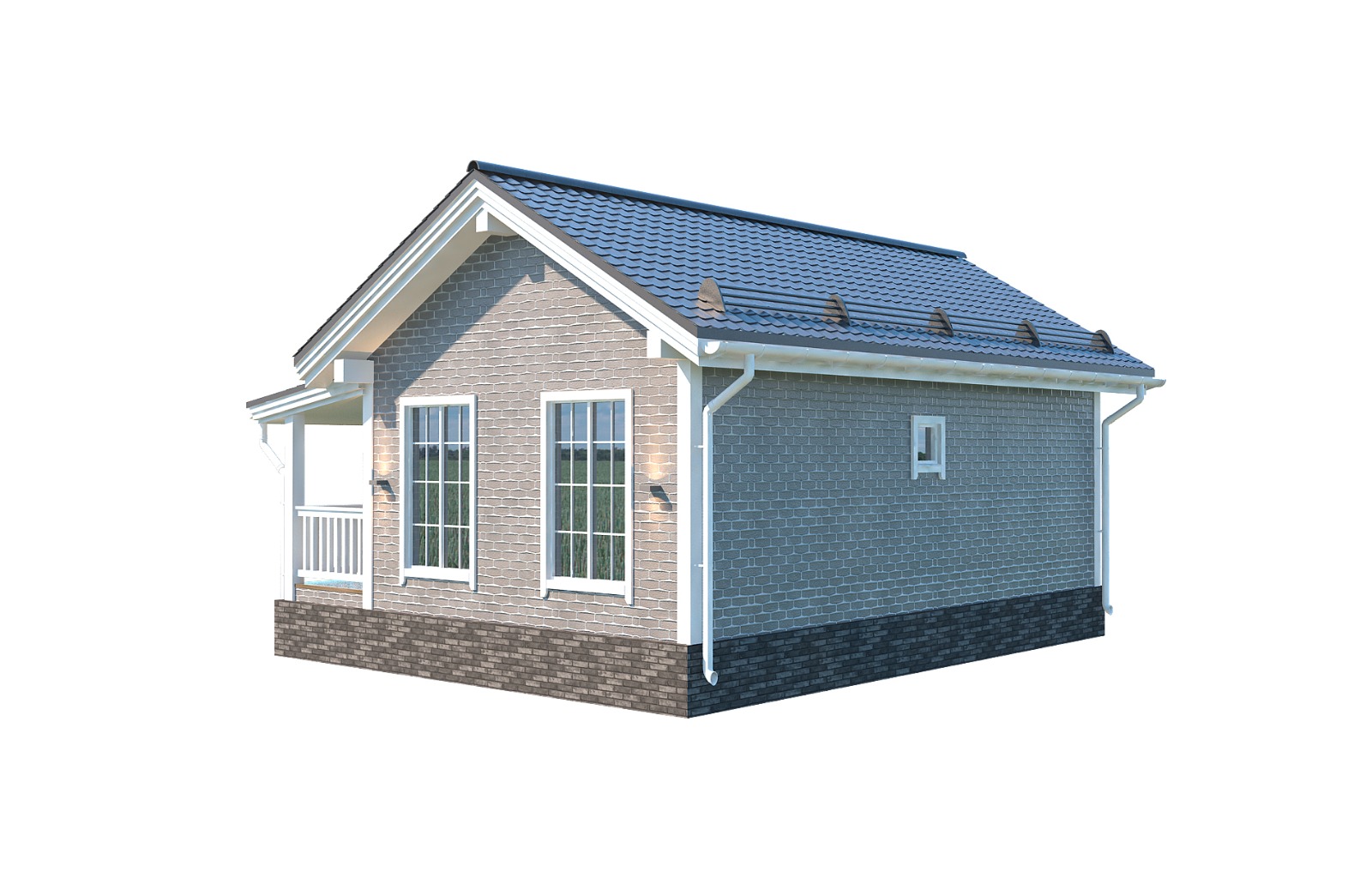 Коттедж встречает нас просторной террасой, которая станет прекрасной площадкой для летнего отдыха. За дверью – компактная прихожая, из которой мы попадаем в светлую гостиную, а уже из нее – на кухню. Спальня изолирована, имеется отдельный вход. Здесь же, справа, предусмотрен удобный совмещенный санузел.